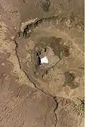 It is a shield volcano with a diameter of 60–70 kilometres (37–43 mi)[15] or 60–80 kilometres (37–50 mi)[12] and an estimated volume of 2,500 cubic kilometres (600 cu mi).[17] The summit of Emi Koussi is formed by two overlapping calderas, which together form a[18] 15-by-11-kilometre (9.3 mi × 6.8 mi) wide[15] elliptical caldera that extends from northwest to southeast.[18] The northern caldera formed first, then the southern caldera which is about 50 metres (160 ft) deeper below the northern one. 400–300-metre (1,310–980 ft) high scarps form the inner margin of the southern caldera,[19] with the floor at an elevation of 2,970 metres (9,740 ft).[20] Before the formation of the calderas, the volcano may have reached a height of 4,000 metres (13,000 ft). Emi Koussi has been compared to a Martian volcano, Elysium Mons.[5][21] The caldera rim is cut by one outlet, the Porte de Modiounga,[22] from which gorges emanate into the caldera.[23] The highest point of Emi Koussi lies on the southern rim of the caldera.[9]