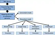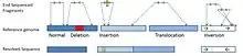 Inversions and translocations are relatively easy to detect by an invalid pair of sequenced-end. For instance, a translocation can be detected if the paired-ends are mapped onto different chromosomes on the reference genome.[4][5] Inversion can be detected by divergent orientation of the reads, where the insert will have two plus-end or two minus-end.