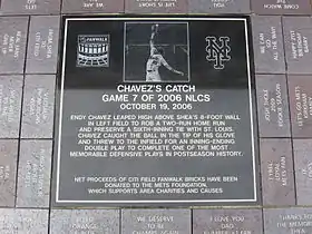 Chávez's signature moment came at Shea Stadium in Game 7 of the 2006 National League Championship Series. In the top of the sixth inning, with the game tied 1–1, Cardinals third baseman Scott Rolen hit a pitch off Mets starter Óliver Pérez. Leaping over the 8-foot-high (2.4 m) left field wall, Chávez caught the ball with the tip of his glove to rob Rolen of a two-run home run. Chávez then threw to cutoff man second baseman José Valentín, who threw to Carlos Delgado at first base to double off Cardinals center fielder Jim Edmonds for an inning-ending double play. "The Catch" was named the top post-season moment in the 5th annual This Year in Baseball Awards. On July 13, 2007, American International Group (the company whose left field advertisement was where Chávez made the catch) sponsored a special Bobblehead Doll day to commemorate the catch. The Left Field entrance gate of the Mets' current ballpark, Citi Field, features a metal silhouette of a baseball player making a leaping catch similar to the one Chávez made in the 2006 NLCS.