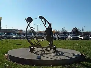 Entangled is an abstract sculpture consisting of eight unique elements bolted together to create an enclosed form. The powder coated steel sculpture measures 108” x 88” x 98” and is constructed from rolled steel tubes and fabricated steel circles. The base of the sculpture is mounted on a 16' diameter concrete pad in the Herron Sculpture Garden.[2] The curved support structure at the base of the sculpture references the shape of a bird’s nest as it encloses and supports the sculptural elements.