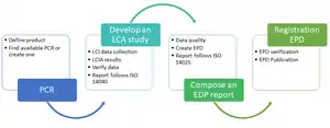 The first step in creating an EPD is defining the product, using the appropriate Product Category Rules (PCR). PCRs are specific rules and requirements verified by an independent, third-party panel. A Life Cycle Inventory (LCI) for the LCA must be verified and from reliable sources (for example, from a manufacturing facility). A Life Cycle Environmental Impact Analysis (LCIA) is performed by an LCA expert using software and a variety of assessment tools.[9] The EPD is delivered as a document or report following a series of verification reviews; it is then ready for registration and publication.[10][3][4][5][6]