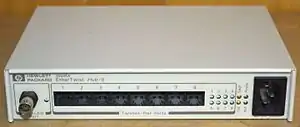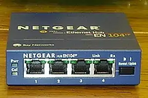 An Ethernet hub, active hub, network hub, repeater hub, multiport repeater, or simply hub is a network hardware device for connecting multiple Ethernet devices together and making them act as a single network segment. It has multiple input/output (I/O) ports, in which a signal introduced at the input of any port appears at the output of every port except the original incoming.[1] A hub works at the physical layer (layer 1) of the OSI model.[2] A repeater hub also participates in collision detection, forwarding a jam signal to all ports if it detects a collision. In addition to standard 8P8C ("RJ45") ports, some hubs may also come with a BNC or an Attachment Unit Interface (AUI) connector to allow connection to legacy 10BASE2 or 10BASE5 network segments.