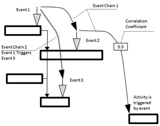 - Correlation coefficient or probability that one event is triggered by another event is presented on event chain in the rectangular box.