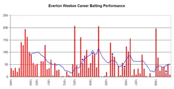 By the end of the series, which also included a century against Ceylon, at that time a non-Test cricketing nation, and a half-century against Pakistan in a match not classed as a Test match, Weekes had a Test batting average of 82.46 and had passed 1,000 Test runs in his twelfth innings, one fewer than Donald Bradman.[31] Early in the tour the West Indian team's cricket kit disappeared and Weekes was surprised to see Indian fishermen wearing flannels and West Indian cricket jumpers.[32] As a result of his series, Weekes was named one of the 1949 Indian Cricket "Cricketers of the Year".[33] The next season saw no Test cricket played by West Indies but Weekes scored 236* against British Guiana at Bridgetown, averaged 219.50 for the season and raised his career first-class average to 72.64.[34]