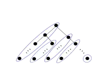 To reason about the recursion tree let the left child problem be the subproblem in the recursive call in step 3 and the right child problem be the subproblem in the recursive call in step 5. Count the total number of edges in the original problem and all subproblems by counting the number of edges in each left path of the tree. A left path begins at either a right child or the root and includes all nodes reachable through a path of left children. The left paths of a binary tree are shown circled in blue in the diagram on the right.
