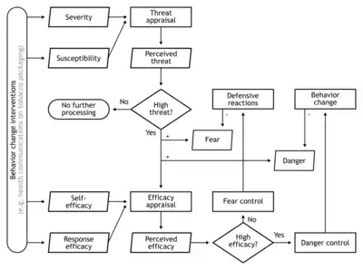 EPPM is based on Leventhal's danger control and fear control framework and on Roger's protection motivation theory.[1] It is commonly used in health communication campaigns when a message is attempting to persuade audience members to adopt a healthy behavior. Fear-framed campaigns must arouse a moderately-high amount of fear but a higher amount of self-efficacy and response efficacy. When there is more fear than efficacy, the message is expected to not be effective.