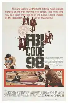 FBI Code 98 is a 1962 crime drama directed by Leslie H. Martinson and produced by Warner Bros. Originally intended as television pilot, the film was instead released theatrically in the United Kingdom in 1962,[1] and in the United States in 1963. FBI Code 98 stars many Warner Bros. contract players such as Jack Kelly, Ray Danton, Andrew Duggan and William Reynolds who later costarred on the Warner Bros Television show The F.B.I.. The film was narrated by William Woodson, who had previously narrated the radio show The FBI in Peace and War.