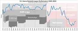 By the 1970s, the club was consistently finishing in the lower half of the league table and was relegated to the second division DDR-Liga for a single season on three occasions late in the decade. They returned to form in the 1980s and as the football leagues of West Germany and East Germany were merged in 1990 after the re-unification of the country, Rostock won its first national championship in the final season of East German football, played out in the transitional NOFV-Oberliga. This is their only top flight title to date in play in East Germany or the unified Germany.