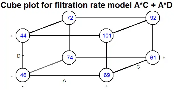 The coefficients for A, C, and D are all positive in the ANOVA, which would suggest running the process with all three variables set to the high value. However, the main effect of each variable is the average over the levels of the other variables. The A:C interaction plot above shows that the effect of factor A depends on the level of factor C, and vice versa. Factor A (temperature) has very little effect on filtration rate when factor C is at the + level. But Factor A has a large effect on filtration rate when factor C (formaldehyde) is at the − level. The combination of A at the + level and C at the − level gives the highest filtration rate. This observation indicates how one-factor-at-a-time analyses can miss important interactions. Only by varying both factors A and C at the same time could the engineer discover that the effect of factor A depends on the level of factor C.