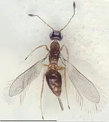 Fairyflies are some of the most common chalcid wasps, but are rarely noticed by humans because of their extremely small sizes. Their adult lifespans are very short, usually only a few days. All known fairyflies are parasitoids of the eggs of other insects, and several species have been successfully used as biological pest control agents.[1]
