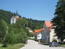 The local parish church is dedicated to the Assumption of Mary and belongs to the Roman Catholic Diocese of Novo Mesto. It is a large building with a triple nave that was built between 1858 and 1864 in the Neo-Romanesque style on the site of an earlier church.[3] A second church in the village is dedicated to Saint Stephen and is a late 16th- or early 17th-century building that was refurbished in the 18th and 19th centuries.[4]