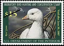 The Federal Duck Stamp, formally known as the Migratory Bird Hunting and Conservation Stamp, is an adhesive stamp issued by the United States federal government that must be purchased prior to hunting for migratory waterfowl such as ducks and geese.[1] It is also used to gain entrance to National Wildlife Refuges that normally charge for admission.[1] It is widely seen as a collectable and a means to raise funds for wetland conservation, with 98% of the proceeds of each sale going to the Migratory Bird Conservation Fund.
