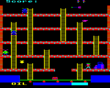 The screen layout is clearly influenced by early platform game Space Panic, set out as a series of platforms and ladders populated by enemy 'gremlins' which also bear more than a passing resemblance to the Space Panic monsters. This is the factory of the title. The player takes the role of Felix, a factory worker, whose job is to ensure the generator, in the bottom right of the screen, does not run out of oil. Felix begins at the generator and must cross the conveyor belt, jumping over parcels (in gameplay similar to Donkey Kong). If Felix fails to jump the parcel, he falls down and is carried along the belt for a short while. If he has time to stand up, he can continue on as normal but if he reaches the end of the belt, he loses a life.