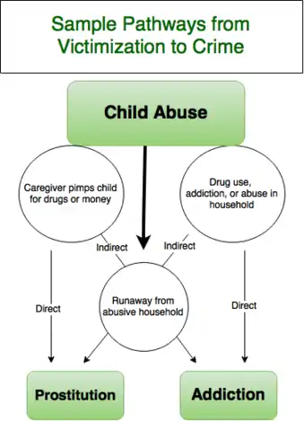 Childhood victimization also has indirect links to future offending. There is evidence that girls from abusive households are more at risk to run away before adulthood, therefore subjecting themselves to an increased risk of becoming involved with drugs or prostitution.[11] The majority of female juvenile offenders report that their first arrest was for running away from an abusive home.[7] Prostitution, property crimes, and drug distribution become means of survival for young female runaways.[7] Additionally, women who were physically or sexually abused as children by caretakers have a significantly higher risk of drug abuse and addiction.[11] Some young women become dependent on drugs to desensitize themselves from their traumatic histories.[7] Women's involvement in drugs or prostitution then significantly increases their chances of arrest or incarceration.[1]