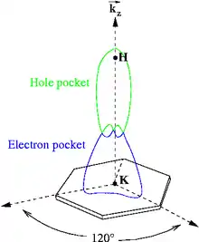 Materials with complex crystal structures can have quite intricate Fermi surfaces. The figure 2 illustrates the anisotropic Fermi surface of graphite, which has both electron and hole pockets in its Fermi surface due to multiple bands crossing the Fermi energy along the direction. Often in a metal the Fermi surface radius is larger than the size of the first Brillouin zone which results in a portion of the Fermi surface lying in the second (or higher) zones. As with the band structure itself, the Fermi surface can be displayed in an extended-zone scheme where is allowed to have arbitrarily large values or a reduced-zone scheme where wavevectors are shown modulo (in the 1-dimensional case) where a is the lattice constant. In the three-dimensional case the reduced zone scheme means that from any wavevector there is an appropriate number of reciprocal lattice vectors subtracted that the new now is closer to the origin in -space than to any . Solids with a large density of states at the Fermi level become unstable at low temperatures and tend to form ground states where the condensation energy comes from opening a gap at the Fermi surface. Examples of such ground states are superconductors, ferromagnets, Jahn–Teller distortions and spin density waves.