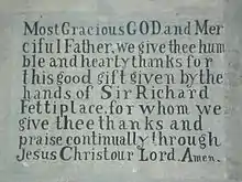 The two triple family monuments at Swinbrook Church in Oxfordshire, with sets of effigies ranged on shelves above each other, are fine examples of English Renaissance and Baroque funerary art.[22] There is a monument to John Fettiplace and an inscription thanking Richard Fettiplace at the parish church of St Laurence, Appleton, Oxfordshire.