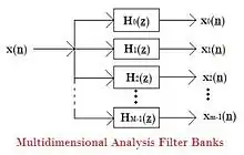 In signal processing, a filter bank is an array of band-pass filters that separates the input signal into multiple components, each one carrying a single frequency sub-band of the original signal.[1][2] One application of a filter bank is a graphic equalizer, which can attenuate the components differently and recombine them into a modified version of the original signal. The process of decomposition performed by the filter bank is called analysis (meaning analysis of the signal in terms of its components in each sub-band); the output of analysis is referred to as a subband signal with as many subbands as there are filters in the filter bank. The reconstruction process is called synthesis, meaning reconstitution of a complete signal resulting from the filtering process.