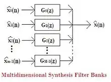 If there is no loss in the decomposition and the subsequent reconstruction, the filter bank is called perfect reconstruction. (in that case we would have .[7] Figure shows a general multidimensional filter bank with N channels and a common sampling matrix M. The analysis part transforms the input signal into N filtered and downsampled outputs . The synthesis part recovers the original signal from by upsampling and filtering. This kind of set up is used in many applications such as subband coding, multichannel acquisition, and discrete wavelet transforms.