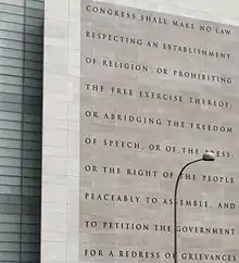 Congress shall make no law respecting an establishment of religion, or prohibiting the free exercise thereof; or abridging the freedom of speech, or of the press; or the right of the people peaceably to assemble, and to petition the Government for a redress of grievances.[3]