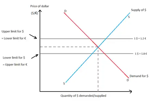 The demand for foreign exchange is derived from the domestic demand for foreign goods, services, and financial assets. The supply of foreign exchange is similarly derived from the foreign demand for goods, services, and financial assets coming from the home country. Fixed exchange-rates are not permitted to fluctuate freely or respond to daily changes in demand and supply. The government fixes the exchange value of the currency. For example, the European Central Bank (ECB) may fix its exchange rate at €1 = $1 (assuming that the euro follows the fixed exchange-rate). This is the central value or par value of the euro. Upper and lower limits for the movement of the currency are imposed, beyond which variations in the exchange rate are not permitted. The "band" or "spread" in Fig.1 is €0.6 (from €1.2 to €1.8).[14]