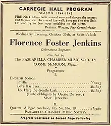 At the age of 76, Jenkins finally yielded to public demand and booked Carnegie Hall for a general-admission performance that took place on October 25, 1944.[20] Tickets for the event sold out weeks in advance; the demand was such that an estimated 2,000 people were turned away at the door of the 2,800-seat venue.[23] Numerous celebrities attended, including Porter, Marge Champion, Gian Carlo Menotti, Kitty Carlisle and Lily Pons with her husband, Andre Kostelanetz, who composed a song for the recital. McMoon later recalled an "especially noteworthy" moment: "[When she sang] 'If my silhouette does not convince you yet/My figure surely will' [from Adele's aria in Die Fledermaus], she put her hands righteously to her hips and went into a circular dance that was the most ludicrous thing I have ever seen. And created a pandemonium in the place. One famous actress had to be carried out of her box because she became so hysterical."[24]