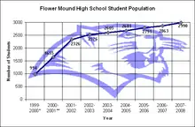 Flower Mound High School (FMHS) is part of Lewisville Independent School District and is located in Flower Mound, Texas, United States. The school rests on 52 acres (21 ha) of land that were purchased in 1993.[2] FMHS was the second high school built in Flower Mound, after Edward S. Marcus High School. With the expansion of the town in the 1980s and 1990s (from 1980 to 2000, it grew from 4,402 to 50,702 residents), a second high school was built to accommodate the growth.[3][4] Flower Mound High School has been called one of the top ten best public high schools in the Dallas area[5] and consistently receives an "Exemplary" (highest) rating from the Texas Education Agency.[6] The school's fight song is the Michigan Wolverines' fight song, "The Victors".