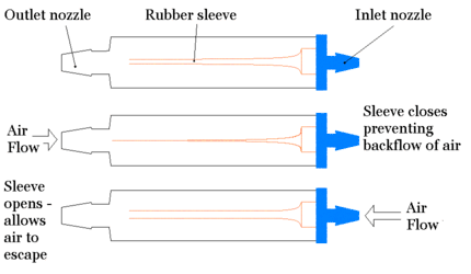 It is most commonly used to help remove air from a pneumothorax. The valve is usually designed as a rubber sleeve within a plastic case where the rubber sleeve is arranged so that when air passes through the valve one way the sleeve opens and lets the air through. However, when air is sucked back the other way, the sleeve closes off and no air is allowed backwards. This construction enables it to act as a one-way valve allowing air (or fluid) to flow only one way along the drainage tube. The end of the drainage tube is placed inside the patient's chest cavity, within the air or fluid to be drained. The flutter valve is placed in the appropriate orientation (most packages are designed so the valve can only be connected in the appropriate orientation) and the pneumothorax is thus evacuated from the patient's chest.[2]