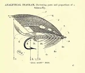 Salmon flies have historically been the most complex and gaudy of artificial flies. Texts describing fly tying techniques often use an image of a salmon fly to describe all the parts of an artificial fly. The parts described below are typical.
