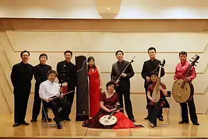 The Forbidden City Chamber Orchestra was jointly created by pipe player Yang Jing and ten musicians dedicated to traditional instruments. These are graduates of Beijing music schools such as Central Conservatory of Music and the China Music Conservatory.[1] Their repertoire includes folk love songs, songs of sorrow, songs that describe China's landscapes and recited passages.[2] Traditional instruments include the huqin and erhu which are similar to the viola and violin, the sanxian, percussion instruments, flutes and voices.[3]