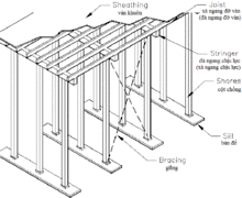 Similar to the traditional method, but stringers and joist are replaced with engineered wood beams and supports are replaced with adjustable metal props. This makes this method more systematic and reusable.