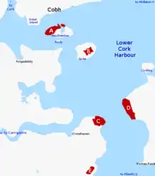 Fort Templebreedy (Irish: Dún Theampall Bríde),[3] also known as Templebreedy Battery, was a coastal defence fortification close to Crosshaven, in County Cork, Ireland. Supplementing a number of earlier structures at Fort Camden and Fort Davis, the site was developed between 1904 and 1909 to defend the mouth of Cork Harbour.[4][5] Used as a coastal artillery position until the 1940s,[4] and as a military training camp until the late 20th century, many of the structures of the 37-acre site were dismantled over time, and part of the complex used as a pitch and putt course.[6] In 2009, Cork County Council added the site to a proposed list of protected structures[7] – though as of 2020 it remains in the ownership of the Department of Defence.[2]