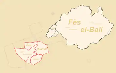 The walls of Fes el-Bali and Fes el-Jdid during the Marinid era. Fes el-Jdid is subdivided into two Muslim neighbourhoods, a Jewish neighbourhood (the Mellah), and the Royal Palace (Dar al-Makhzen).