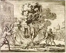 This square was possibly part of Constantine the Great's original city plan design;[1] like the other fora of Constantinople, it was certainly built sometime in the 4th century.[1] The name of the square originated from a large, hollow bronze statue representing the head of an ox.[1][2] The statue, brought to Constantinople from Pergamum in Asia Minor, was used both as a furnace and a device implementing the brazen bull torture: people were closed inside the ox, which then was heated until they suffocated and burned.[1][2] During the first persecution of Christians in Asia Minor under Emperor Domitian (r. 81–96) the Ox, still in Pergamum, was used to execute Saint Antipas.[2] According to the Patrologia Latina, in the reign of Julian the Apostate (r. 361–363) many Christians were burned inside the Bull, at that time already moved to Constantinople.[3] In 562 the Forum, at that time surrounded by warehouses and workshops, burned down.[1] The body of the usurper Phocas (r. 602–610) was also incinerated in the ox's head following his deposition.[1][3] According to some sources, [3] Emperor Heraclius (r. 610–641) melted the statue to mint coins needed to pay his army for his war against the Persians. However, this is not certain since executions using the Ox continue to be attested after Heraclius's reign, for example, when Justinian II (r.685-695; 705-711) let burn in the Ox the two Patricians Theodoros and Stephanos, both involved in a failed plot against him. [3] The same Emperor enlarged and adorned the square.[4] During the Byzantine Iconoclasm, Saint Theodosia (d. 729) and Saint Andrew of Crete (d. 766), both defenders of icon veneration, were executed in the square.[3] The former was executed by having a ram's horn hammered through her neck.[5]
