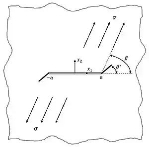 In the prior section, only straight-ahead crack growth from the application of load resulting in a single mode of fracture was considered. However, this is clearly an idealization; in real-world systems, mixed-mode loading (some combination of Mode-I, Mode-II, and Mode-III loading) is applied. In mixed-mode loading, cracks will generally not advance straight ahead.[12] Several theories have been proposed to explain crack kinking and crack propagation in mixed-mode loading, and two are highlighted below.![]() Application of uniform tension on a crack of length in an infinite planar body to induce mixed Mode-I and Mode-II loading. The solids lines extending out from the crack tips are the crack kinks. Maximum hoop stress theoryConsider a crack of length housed in an infinite planar body subjected to mixed Mode-I and Mode-II loadings via uniform tension , where is the angle between the original crack plane and the direction of applied tension and is the angle between the original crack plane and the direction of kinking crack growth. Sih, Paris, and Erdogan showed that the stress intensity factors far from the crack tips in this planar loading geometry are simply and .[13] Additionally, Erdogan and Sih[14] postulated the following for this system: