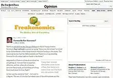 In May 2007, writer and blogger Melissa Lafsky was hired as the full-time editor of the site.[23] In August 2007, the blog was incorporated into The New York Times' web site – the authors had been writing joint columns for The New York Times Magazine since 2004 – and the domain Freakonomics.com became a redirect there.[24] In March 2008, Annika Mengisen replaced Lafsky as the blog editor.[25] The Freakonomics blog ended its association with The New York Times on March 1, 2011.[26]