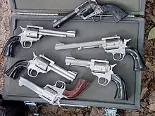 A number of variants upon the Model 83 have been produced, all with five-shot cylinders. The first was a .45 Colt in February 1986 (54 examples sold 1986-1989, serial numbers E7201-E7254), followed closely by a .44 Magnum version.[5] In 1991, Freedom Arms introduced the Model 252 in .22 long rifle and in 1992 the model 353 in .357 Magnum, including a 9 inch variation produced to meet the 4lb maximum weight requirement for IHMSA Silhouette competition. In 1993 the Model 555 was introduced in .50 Action Express. .41 Magnum and .475 Linebaugh chamberings were introduced in 1997 and 1999 respectively.[1][6] Freedom Arms introduced their own .500 Wyoming Express in the Model 83 .500 WE in 2005.[7]