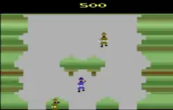 The tank battle continues until the player reaches the enemy's fort. The fort is a brick-barricaded tank which fires mortar rounds while the player attempts to take it out. In order to destroy this tank, the player must toss a grenade over the brick barricade, which can only be accomplished on foot. Once this is done, the tank will explode and an enemy soldier will wave a white flag, signalling surrender, plus 1,000 bonus points. The game repeats again with the infantry level, but enemy soldiers become increasingly quicker and deadlier in successive rounds; points are multiplied based on the level played.