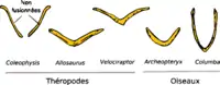 Several groups of theropod dinosaurs have also been found with furculae, including dromaeosaurids, oviraptorids,[4] tyrannosaurids,[5] troodontids, coelophysids[6] and allosauroids.[4]