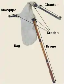 The drone (ruchilo, ison, prdaljka, prdak, brčalo) is a long pipe which provides a constant harmony note, and thus has no finger-holes. It is generally a long, three-piece tube with a note much lower than that of the chanter.