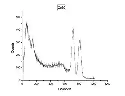 , with two gamma rays with 1.17 MeV and 1.33 MeV respectively. (See the decay scheme article for the decay scheme of cobalt-60.) The two gamma lines can be seen well-separated; the peak to the left of channel 200 most likely indicates a strong background radiation source that has not been subtracted. A backscatter peak can be seen at channel 150, similar to the second peak in Figure 1.
