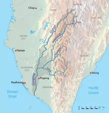The Gaoping River, also spelled Kaoping River (Chinese: 高屏溪; pinyin: Gāopíng Xī; Wade–Giles: Kao1-p'ing2 Hsi1),[2] is a major river of southern Taiwan, flowing through Pingtung County and Kaohsiung City. It is the largest river in Taiwan by drainage area.[3] The river is 171 kilometres (106 mi) long, draining a rugged area on the western side of the Central Mountain Range.[1]