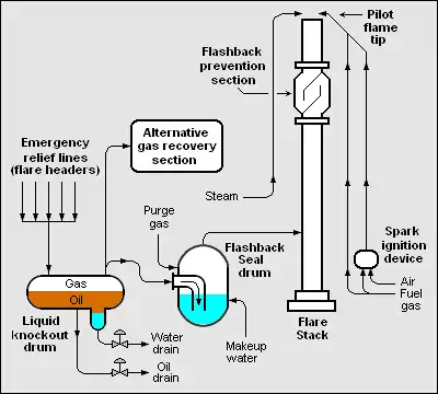 The adjacent flow diagram depicts the typical components of an overall industrial flare stack system:[1][2][3]