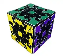 The Gear Cube is a 3-D combination puzzle designed and created by Dutch puzzle maker Oskar van Deventer based on an idea by Bram Cohen.[1] It was initially produced by Shapeways in 2009 and known as "Caution Cube" due to the likeliness of getting fingers stuck between the gears while speedcubing.[2] Later, in 2010, it was mass-produced by Meffert's as the "Gear Cube".[3]