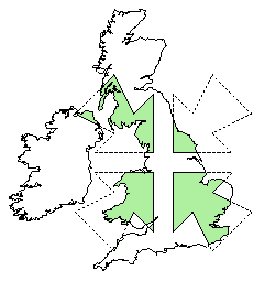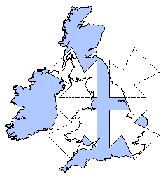 The following four images show examples of GPC computing operations between two polygon sets. The first polygon set comprises outlines of the United Kingdom and Ireland. The second polygon set comprises the four large inward-pointing arrows. In each example, the areas resulting from the GPC operation between the two sets of polygons are rendered in colour.