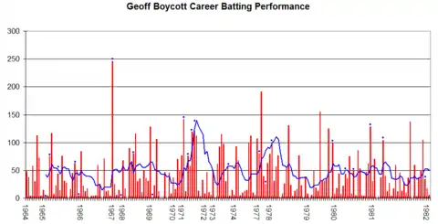 Boycott made his international debut in a 1964 Test match against Australia.[4][5] He was known for his ability to occupy the crease and became a key feature of England's Test batting line-up for many years, although he was less successful in his limited One Day International (ODI) appearances.[6] He accumulated large scores – he is the equal fifth-highest accumulator of first-class centuries in history, eighth in career runs and the first English player to average over 100 in a season (1971 and 1979) – but often encountered friction with his teammates.[4][7][8]