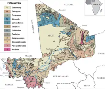 The underlying rocks of the West African craton are covered in the northwest by sediments of the Taoudeni basin, with two main outcrops of crystalline rocks in the northern Reguibat shield in Mauritania and the southern Leo shield which includes the Bougouni and Kenieba outcrops, both of which contain valuable minerals.[6] There may also be petroleum reserves in the Taoudeni basin.[7]