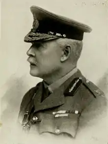 He left the 140th Brigade in early July 1916, promoted to command 39th Division.[9] He commanded it during the later phases of the Battle of the Somme and the Battle of Pilckem.[10] His record with the division was not well received by his superiors; Claud Jacob of II Corps described him as "obstinate and mulish" during the Battle of the Somme, whilst Ivor Maxse of XVIII Corps noted he had "little or no conception of training methods", and "few ideas" regarding tactical operations; his only merit was perceived to be his rigorous approach to discipline.[11] He was removed from command in August 1917, and transferred to command the 72nd Division on home service. He later commanded Shorncliffe Army Camp, before retiring from the Army in 1919.[2]
