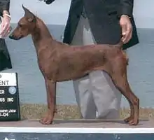 The German Pinscher is a medium-sized dog, usually weighing between 25–45 pounds (11–20 kilograms) and typically 17–20 inches (43–51 centimetres) in height, with a short coat.[2] Colors for this breed include black and rust, blue and tan, red, and fawn. The ideal German Pinscher is elegant in appearance with a strong square build and moderate body structure, muscular and powerful endurance and agility.[3] For all countries where the Fédération Cynologique Internationale standard applies, only black and rust and solid red are allowed colors. Colors that became extinct during the two World Wars of the 20th century include solid black, pepper-and-salt, and harlequin.