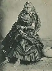 Luanchari (Hindi: लुआंचणी) is a full-dress garment. The luanchari is made up of two parts. The upper part is called choli, and is made of the same fabric as of the lehanga, but it is not uncommon to find the two pieces of the garment in different colours. The choli is stitched to the lehanga, to make a one-piece luanchari. This is commonly worn by the women in Pahari miniatures, and is quite similar to lehanga.[15] It may take over 21 yards of cloth to make a complete luanchari.[16] It is a traditional garment worn by Gaddis of Himachal Pradesh.[15]