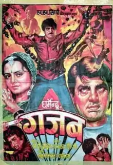 Ghazab (transl. Amazing) is a 1982 Bollywood action comedy-drama film starring Dharmendra and Rekha. The film was a remake of the Tamil film Kalyanaraman.[1] The movie was a 'Hit' and the performance of Dharmendra was critically acclaimed.